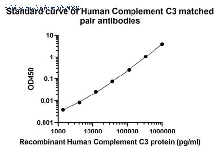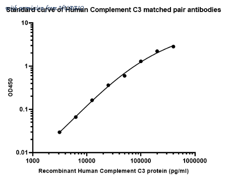 Sandwich ELISA analysis of Complement C3 matched pair antibodies Capture: HA725140, Human Complement C3 Rabbit mAb [PSH15-07] Detector: HA725141, Human Complement C3 Rabbit mAb [PSH15-08] Elisa assay was performed by coating wells of a 96-well plate with 50 µl per well of capture antibody (HA725140) diluted in carbonate/bicarbonate buffer, at a concentration of 2 µg/ml overnight at 4℃. Wells of the plate were washed, blocked with 150 µl 0.05% tween-20 1% BSA blocking buffer, and incubated with serial diluted Recombinant Human Complement C3 protein (HA211092) starting from 400,000 pg/ml to 0 pg/ml and detect antibody (HA725141, Biotin, 0.2 µg/ml) for 1 hour at 30℃ with shaking. Then the plate was washed and incubated with 50 µl per well of SA-HRP for 0.5 hour at 30℃ with shaking. Detection was performed using an Ultra TMB Substrate for 10 minutes at room temperature in the dark. The reaction was stopped with sulfuric acid and absorbances were read on a spectrophotometer at 450 nm.