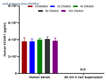 Interpolated concentrations of native VCAM-1 in human samples. Capture: HA725064, Human VCAM-1 Rabbit mAb [PSH12-46] Detector: HA725065, Human VCAM-1 Rabbit mAb [PSH12-47] Interpolated concentration of native VCAM-1 was measured in duplicate at different sample concentrations. Undiluted samples were 1% human serum. The interpolated dilution factor corrected values were plotted (mean +/- SD, n=2). The mean VCAM-1 concentration was determined to be 1,361,999 pg/mL in human serum. There was no detectable signal in SK-OV-3 cell culture supernatant.