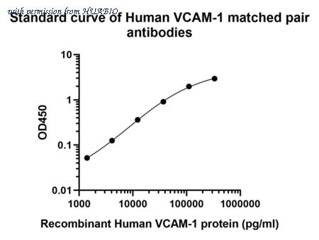 Sandwich ELISA analysis of Human VCAM-1 matched pair antibodies Capture: HA725064, Human VCAM-1 Rabbit mAb [PSH12-46] Detector: HA725065, Human VCAM-1 Rabbit mAb [PSH12-47] Elisa assay was performed by coating wells of a 96-well plate with 100 µl per well of capture antibody (HA725064) diluted in carbonate/bicarbonate buffer, at a concentration of 2ug/ml overnight at 4℃. Wells of the plate were washed, blocked with 150 µl 0.05% tween-20 1% BSA blocking buffer, and incubated with serial diluted Recombinant Human VCAM-1 protein (HA210976) protein starting from 10,000 pg/ml to 0 pg/ml and detect antibody (HA725065, Biotin, 0.2 µg/ml) for 1 hour at 30℃ with shaking. Then the plate was washed and incubated with 100 µl per well of SA-HRP for 0.5 hour at 30℃ with shaking. Detection was performed using an Ultra TMB Substrate for 10 minutes at room temperature in the dark. The reaction was stopped with sulfuric acid and absorbances were read on a spectrophotometer at 450 nm.