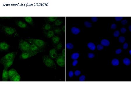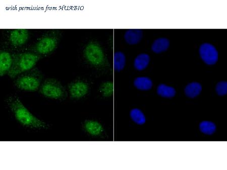 ICC staining Vitamin D Receptor in LOVO cells (green). The nuclear counter stain is DAPI (blue). Cells were fixed in paraformaldehyde, permeabilised with 0.25% Triton X100/PBS.