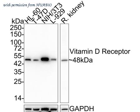 Western blot analysis of Vitamin D Receptor on different lysates with Rabbit anti-Vitamin D Receptor antibody (HA750402) at 1/5,000 dilution. Lane 1: HL-60 cell lysate (15 µg/Lane) Lane 2: T-47D cell lysate (15 µg/Lane) Lane 3: NIH/3T3 cell lysate (15 µg/Lane) Lane 4: L-929 cell lysate (15 µg/Lane) Lane 5: Rat kidney tissue lysate (20 µg/Lane) Predicted band size: 48 kDa Observed band size: 48 kDa Exposure time: 30 seconds; 4-20% SDS-PAGE gel. Proteins were transferred to a PVDF membrane and blocked with 5% NFDM/TBST for 1 hour at room temperature. The primary antibody (HA750402) at 1/5,000 dilution was used in 5% NFDM/TBST at 4℃ overnight. Goat Anti-Rabbit IgG - HRP Secondary Antibody (HA1001) at 1/50,000 dilution was used for 1 hour at room temperature.