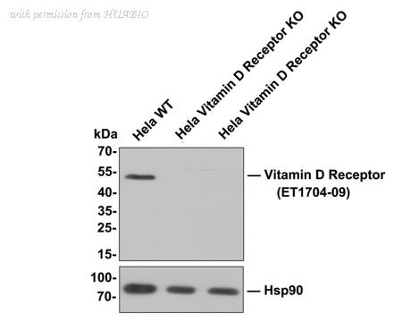 All lanes: Western blot analysis of Vitamin D Receptor with anti-Vitamin D Receptor antibody[JA11-16] (ET1704-09) at 1:500 dilution. Lane 1: Wild-type Hela whole cell lysate (10 µg). Lane 2/3: Vitamin D Receptor knockout Hela whole cell lysate (10 µg). ET1704-09 was shown to specifically react with Vitamin D Receptor in wild-type Hela cells. No bands were observed when Vitamin D Receptor knockout sample were tested. Wild-type and Vitamin D Receptor knockout samples were subjected to SDS-PAGE. Proteins were transferred to a PVDF membrane and blocked with 5% NFDM in TBST for 1 hour at room temperature. The primary antibody (ET1704-09, 1/500) was used in 5% BSA at room temperature for 2 hours. Goat Anti-Rabbit IgG-HRP Secondary Antibody (HA1001) at 1:100,000 dilution was used for 1 hour at room temperature.