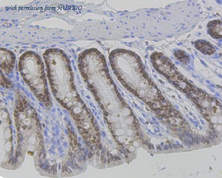 Immunohistochemical analysis of paraffin-embedded rat large intestine tissue using anti-Vitamin D Receptor antibody. The section was pre-treated using heat mediated antigen retrieval with sodium citrate buffer (pH 6.0) (high pressure) for 2 minutes. The tissues were blocked in 5% BSA for 30 minutes at room temperature, washed with ddH2O and PBS, and then probed with the primary antibody (HA750402, 1/50) for 30 minutes at room temperature. The detection was performed using an HRP conjugated compact polymer system. DAB was used as the chromogen. Tissues were counterstained with hematoxylin and mounted with DPX.