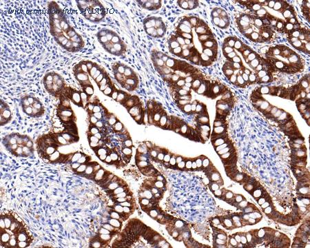 Immunohistochemical analysis of paraffin-embedded human colon tissue with Rabbit anti-Villin1 antibody (ET7110-55) at 1/1,000 dilution. The section was pre-treated using heat mediated antigen retrieval with Tris-EDTA buffer (pH 9.0) for 20 minutes. The tissues were blocked in 1% BSA for 20 minutes at room temperature, washed with ddH2O and PBS, and then probed with the primary antibody (ET7110-55) at 1/1,000 dilution for 1 hour at room temperature. The detection was performed using an HRP conjugated compact polymer system. DAB was used as the chromogen. Tissues were counterstained with hematoxylin and mounted with DPX.