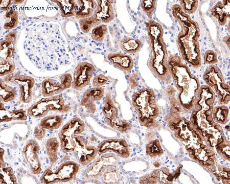 Immunohistochemical analysis of paraffin-embedded human kidney tissue with Rabbit anti-Villin1 antibody (HA721134) at 1/3,000 dilution. The section was pre-treated using heat mediated antigen retrieval with Tris-EDTA buffer (pH 9.0) for 20 minutes. The tissues were blocked in 1% BSA for 20 minutes at room temperature, washed with ddH2O and PBS, and then probed with the primary antibody (HA721134) at 1/3,000 dilution for 1 hour at room temperature. The detection was performed using an HRP conjugated compact polymer system. DAB was used as the chromogen. Tissues were counterstained with hematoxylin and mounted with DPX.
