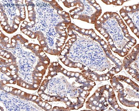 Immunohistochemical analysis of paraffin-embedded human small intestine tissue with Rabbit anti-Villin1 antibody (HA721129) at 1/3,500 dilution. The section was pre-treated using heat mediated antigen retrieval with Tris-EDTA buffer (pH 9.0) for 20 minutes. The tissues were blocked in 1% BSA for 20 minutes at room temperature, washed with ddH2O and PBS, and then probed with the primary antibody (HA721129) at 1/3,500 dilution for 1 hour at room temperature. The detection was performed using an HRP conjugated compact polymer system. DAB was used as the chromogen. Tissues were counterstained with hematoxylin and mounted with DPX.