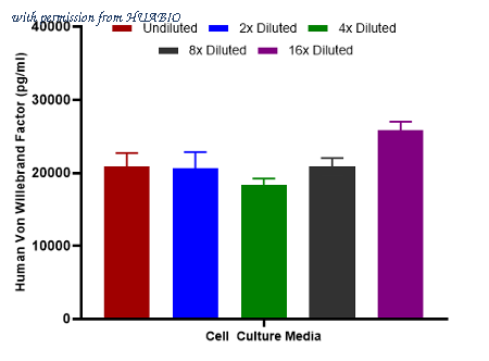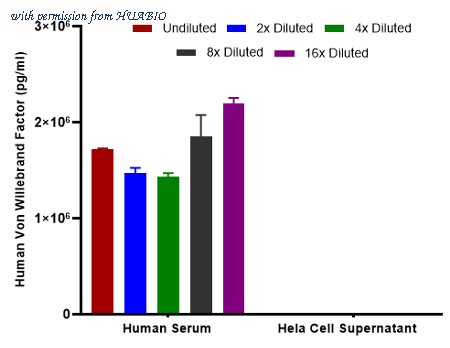 Interpolated concentrations of native Von Willebrand Factor in human samples. Interpolated concentration of native Von Willebrand Factor was measured in duplicate at different sample concentrations and interpolated from the Von Willebrand Factor standard curves. Undiluted samples were 2% human serum and 100% cell supernatant. The interpolated dilution factor corrected values were plotted (mean +/- SD, n=2). The mean Von Willebrand Factor concentration was determined to be 1.73 ug/mL in human serum. There was no detectable signal in Hela cell supernatant.