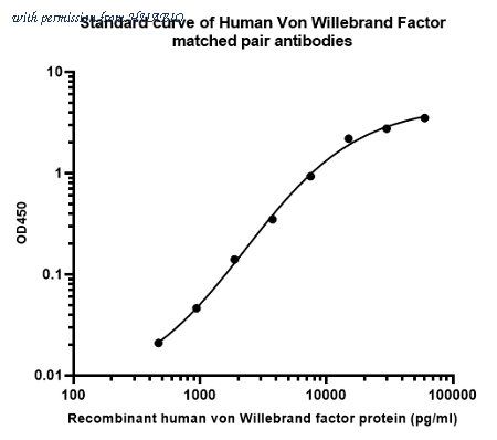 Sandwich ELISA analysis of human Von Willebrand Factor matched pair antibodies Elisa assay was performed by coating wells of a 96-well plate with 100 µl per well of capture antibody (HA723058) diluted in carbonate/bicarbonate buffer, at a concentration of 5ug/ml overnight at 4℃. Wells of the plate were washed, blocked with 150 µl 0.05% tween-20 1% BSA blocking buffer, and incubated with serial diluted Human Von Willebrand Factor protein (HA210992) starting from 60000 pg/ml to 0 pg/ml and detect antibody (HA72359, Biotin, 0.2 µg/ml) for 1 hour at 30℃ with shaking. Then the plate was washed and incubated with 100 µl per well of SA-HRP for 0.5 hour at 30℃ with shaking. Detection was performed using an Ultra TMB Substrate for 10 minutes at room temperature in the dark. The reaction was stopped with sulfuric acid and absorbances were read on a spectrophotometer at 450 nm.
