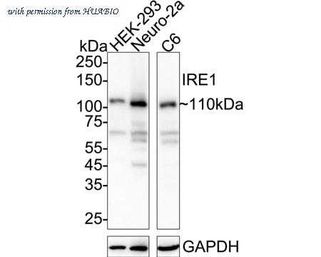 Western blot analysis of IRE1 on different lysates with Rabbit anti-IRE1 antibody (ER1902-90) at 1/2,000 dilution. Lane 1: HEK-293 cell lysate Lane 2: Neuro-2a cell lysate Lane 3: C6 cell lysate Lysates/proteins at 20 µg/Lane. Predicted band size: 110 kDa Observed band size: 110 kDa Exposure time: 59 seconds; ECL: K1801; 4-20% SDS-PAGE gel. Proteins were transferred to a PVDF membrane and blocked with 5% NFDM/TBST for 1 hour at room temperature. The primary antibody (ER1902-90) at 1/2,000 dilution was used in 5% NFDM/TBST at 4℃ overnight. Goat Anti-Rabbit IgG - HRP Secondary Antibody (HA1001) at 1/50,000 dilution was used for 1 hour at room temperature.