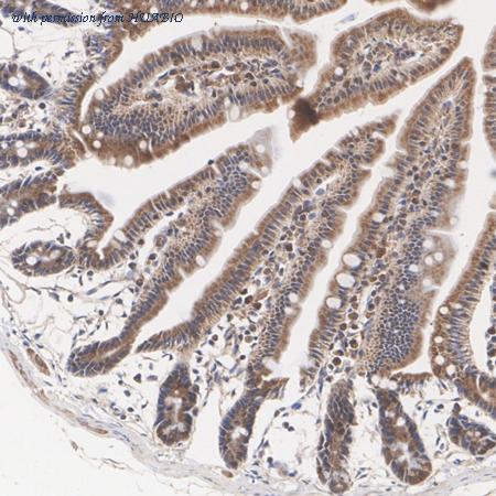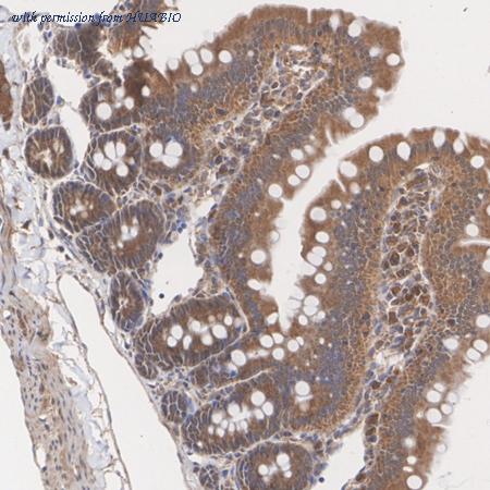 Immunohistochemical analysis of paraffin-embedded mouse small intestine tissue with Rabbit anti-IRE1 antibody (ER1902-90) at 1/100 dilution. The section was pre-treated using heat mediated antigen retrieval with Tris-EDTA buffer (pH 9.0) for 20 minutes. The tissues were blocked in 1% BSA for 20 minutes at room temperature, washed with ddH2O and PBS, and then probed with the primary antibody (ER1902-90) at 1/100 dilution for 1 hour at room temperature. The detection was performed using an HRP conjugated compact polymer system. DAB was used as the chromogen. Tissues were counterstained with hematoxylin and mounted with DPX.