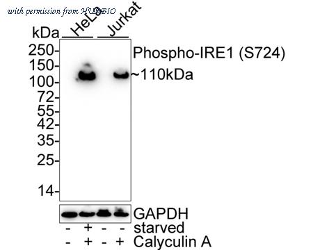 Western blot analysis of Phospho-IRE1 (S724) on different lysates with Rabbit anti-Phospho-IRE1 (S724) antibody (HA721980) at 1/1,000 dilution. Lane 1: HeLa cell lysate (20 µg/Lane) Lane 2: HeLa starved for 3 hours then treated with 100nM Calyculin A for 30 minutes cell lysate (20 µg/Lane) Lane 3: Jurkat cell lysate (20 µg/Lane) Lane 4: Jurkat treated with 100nM Calyculin A for 30 minutes cell lysate (20 µg/Lane) Predicted band size: 110 kDa Observed band size: 110 kDa Exposure time: 5 minutes 10 seconds; ECL: K1801; 4-20% SDS-PAGE gel. Proteins were transferred to a PVDF membrane and blocked with 5% NFDM/TBST for 1 hour at room temperature. The primary antibody (HA721980) at 1/1,000 dilution was used in 5% NFDM/TBST at 4℃ overnight. Goat Anti-Rabbit IgG - HRP Secondary Antibody (HA1001) at 1/50,000 dilution was used for 1 hour at room temperature.