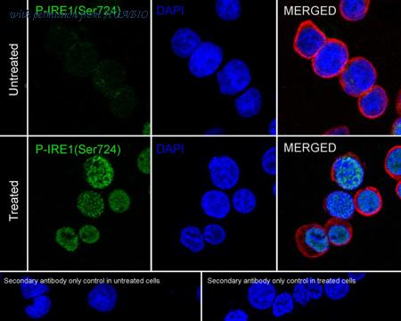 Immunocytochemistry analysis of Jurkat cells treated with 100nM Calyculin A for 30 minutes labeling Phospho-IRE1 (S724) with Rabbit anti-Phospho-IRE1 (S724) antibody (HA721980) at 1/500 dilution. Cells were fixed in 4% paraformaldehyde for 20 minutes at room temperature, permeabilized with 0.1% Triton X-100 in PBS for 5 minutes at room temperature, then blocked with 1% BSA in 10% negative goat serum for 1 hour at room temperature. Cells were then incubated with Rabbit anti-Phospho-IRE1 (S724) antibody (HA721980) at 1/500 dilution in 1% BSA in PBST overnight at 4 ℃. Goat Anti-Rabbit IgG H&L (iFluor™ 488, HA1121) was used as the secondary antibody at 1/1,000 dilution. PBS instead of the primary antibody was used as the secondary antibody only control. Nuclear DNA was labelled in blue with DAPI. Beta tubulin (M1305-2, red) was stained at 1/100 dilution overnight at +4℃. Goat Anti-Mouse IgG H&L (iFluor™ 594, HA1126) was used as the secondary antibody at 1/1,000 dilution.