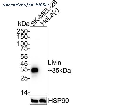 Western blot analysis of Livin on different lysates with Rabbit anti-Livin antibody (HA723483) at 1/5,000 dilution.
