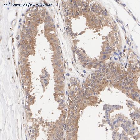 The section was pre-treated using heat mediated antigen retrieval with Tris-EDTA buffer (pH 9.0) for 20 minutes. The tissues were blocked in 1% BSA for 20 minutes at room temperature, washed with ddH2O and PBS, and then probed with the primary antibody (HA723483) at 1/2,000 dilution for 1 hour at room temperature. The detection was performed using an HRP conjugated compact polymer system. DAB was used as the chromogen. Tissues were counterstained with hematoxylin and mounted with DPX.
