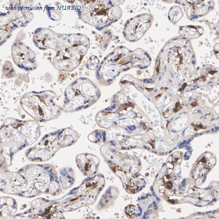 Immunohistochemical analysis of paraffin-embedded human placenta tissue with Rabbit anti-Livin antibody (HA723483) at 1/2,000 dilution.
