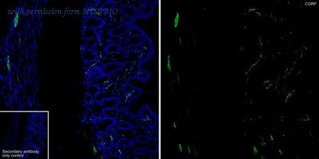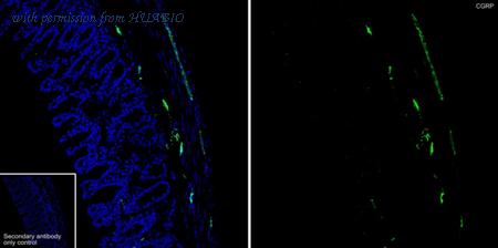 Immunofluorescence analysis of frozen mouse colon tissue with Rat anti-CGRP antibody (HA601423) at 1/500 dilution. The section was not undergone antigen retrieval. The tissues were blocked in 10% negative goat serum for 1 hour at room temperature, washed with PBS, and then probed with the primary antibody (HA601423, green) at 1/500 dilution overnight at 4 ℃, washed with PBS. Goat Anti-Rat IgG H&L (iFluor™ 488, HA1133) was used as the secondary antibody at 1/1,000 dilution. Nuclei were counterstained with DAPI (blue).