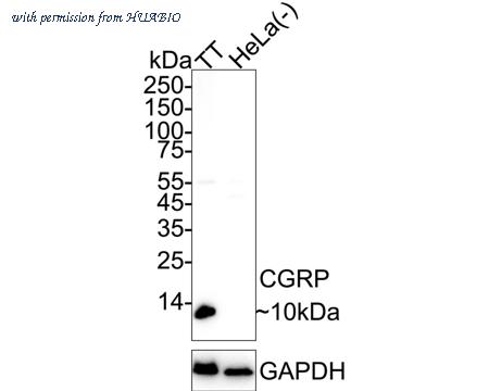 Western blot analysis of CGRP on different lysates with Rabbit anti-CGRP antibody (HA751220) at 1/2,000 dilution. Lane 1: TT cell lysate Lane 2: HeLa cell lysate (negative) Lysates/proteins at 20 µg/Lane. Predicted band size: 14 kDa Observed band size: 10 kDa Exposure time: 1 minute; ECL: K1802; 4-20% SDS-PAGE gel. Proteins were transferred to a PVDF membrane and blocked with 5% NFDM/TBST for 1 hour at room temperature. The primary antibody (HA751220) at 1/2,000 dilution was used in 5% NFDM/TBST at room temperature for 2 hours. Goat Anti-Rabbit IgG - HRP Secondary Antibody (HA1001) at 1/50,000 dilution was used for 1 hour at room temperature.
