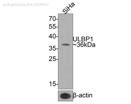 Western blot analysis of ULBP1 on SiHa cell lysates with Rabbit anti-ULBP1 antibody (HA720092) at 1/500 dilution. Lysates/proteins at 10 µg/Lane. Predicted band size: 28 kDa Observed band size: 36 kDa Exposure time: 2 minutes; 12% SDS-PAGE gel. Proteins were transferred to a PVDF membrane and blocked with 5% NFDM/TBST for 1 hour at room temperature. The primary antibody (HA720092) at 1/500 dilution was used in 5% NFDM/TBST at room temperature for 2 hours. Goat Anti-Rabbit IgG - HRP Secondary Antibody (HA1001) at 1:200,000 dilution was used for 1 hour at room temperature.