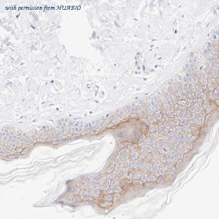 Immunohistochemical analysis of paraffin-embedded human skin tissue with Rabbit anti-Nectin-4 antibody (HA751315) at 1/200 dilution. The section was pre-treated using heat mediated antigen retrieval with Tris-EDTA buffer (pH 9.0) for 20 minutes. The tissues were blocked in 1% BSA for 20 minutes at room temperature, washed with ddH2O and PBS, and then probed with the primary antibody (HA751315) at 1/200 dilution for 1 hour at room temperature. The detection was performed using an HRP conjugated compact polymer system. DAB was used as the chromogen. Tissues were counterstained with hematoxylin and mounted with DPX.