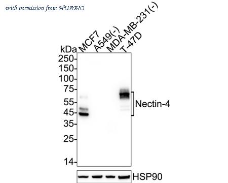 Western blot analysis of Nectin-4 on different lysates with Rabbit anti-Nectin-4 antibody (HA723138) at 1/2,000 dilution. Lane 1: MCF7 cell lysate (15 µg/Lane) Lane 2: A549 cell lysate (negative) (15 µg/Lane) Lane 3: MDA-MB-231 cell lysate (negative) (15 µg/Lane) Lane 4: T-47D cell lysate (15 µg/Lane) Predicted band size: 55 kDa Observed band size: 45-70 kDa Exposure time: 42 seconds; ECL: K1801; 4-20% SDS-PAGE gel. Proteins were transferred to a PVDF membrane and blocked with 5% NFDM/TBST for 1 hour at room temperature. The primary antibody (HA723138) at 1/2,000 dilution was used in 5% NFDM/TBST at 4℃ overnight. Goat Anti-Rabbit IgG - HRP Secondary Antibody (HA1001) at 1/50,000 dilution was used for 1 hour at room temperature.