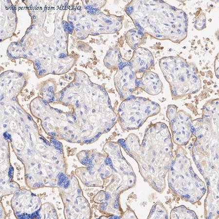 Immunohistochemical analysis of paraffin-embedded human placenta tissue with Rabbit anti-Nectin-4 antibody (HA751315) at 1/1,000 dilution. The section was pre-treated using heat mediated antigen retrieval with Tris-EDTA buffer (pH 9.0) for 20 minutes. The tissues were blocked in 1% BSA for 20 minutes at room temperature, washed with ddH2O and PBS, and then probed with the primary antibody (HA751315) at 1/1,000 dilution for 1 hour at room temperature. The detection was performed using an HRP conjugated compact polymer system. DAB was used as the chromogen. Tissues were counterstained with hematoxylin and mounted with DPX.