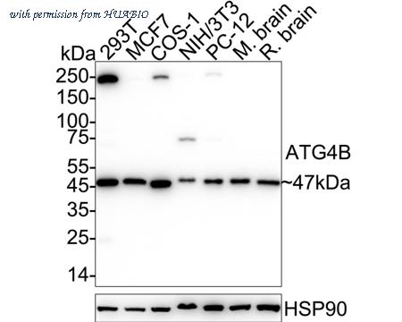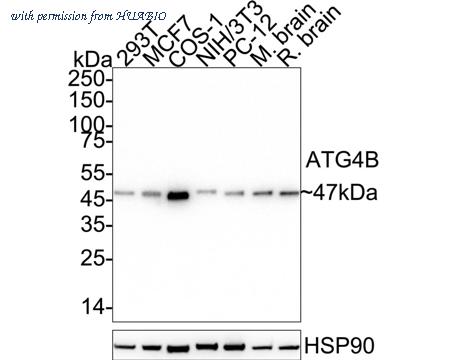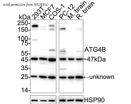 Western blot analysis of ATG4B on different lysates with Rabbit anti-ATG4B antibody (HA721334) at 1/5,000 dilution. Lane 1: 293T cell lysate Lane 2: MCF7 cell lysate Lane 3: COS-1 cell lysate Lane 4: NIH/3T3 cell lysate Lane 5: PC-12 cell lysate Lane 6: Mouse brain tissue lysate Lane 7: Rat brain tissue lysate Lysates/proteins at 20 µg/Lane. Predicted band size: 44 kDa Observed band size: 47 kDa Exposure time: 20 seconds; ECL: K1801; 4-20% SDS-PAGE gel. Proteins were transferred to a PVDF membrane and blocked with 5% NFDM/TBST for 1 hour at room temperature. The primary antibody (HA721334) at 1/5,000 dilution was used in primary antibody dilution (K1803) at 4℃ overnight. Goat Anti-Rabbit IgG - HRP Secondary Antibody (HA1001) at 1/50,000 dilution was used for 1 hour at room temperature.