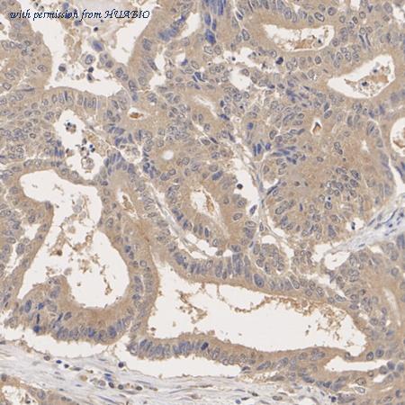 Immunohistochemical analysis of paraffin-embedded human colon cancer tissue with Rabbit anti-ATG4B antibody (ER62759) at 1/1,000 dilution. The section was pre-treated using heat mediated antigen retrieval with Tris-EDTA buffer (pH 9.0) for 20 minutes. The tissues were blocked in 1% BSA for 20 minutes at room temperature, washed with ddH2O and PBS, and then probed with the primary antibody (ER62759) at 1/1,000 dilution for 1 hour at room temperature. The detection was performed using an HRP conjugated compact polymer system. DAB was used as the chromogen. Tissues were counterstained with hematoxylin and mounted with DPX.