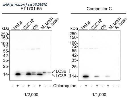 Western blot analysis of LC3B on different lysates with Rabbit anti-LC3B antibody (ET1701-65) at 1/2,000 dilution and competitor's antibody at 1/1,000 dilution. Lane 1: HeLa cell lysate (20 µg/Lane) Lane 2: HeLa treated with 50μM Chloroquine for 18 hours cell lysate (20 µg/Lane) Lane 3: C2C12 cell lysate (20 µg/Lane) Lane 4: C2C12 treated with 50μM Chloroquine for 18 hours cell lysate (20 µg/Lane) Lane 5: C6 cell lysate (20 µg/Lane) Lane 6: C6 treated with 50μM Chloroquine for 18 hours cell lysate (20 µg/Lane) Lane 7: mouse brain tissue lysate (20 µg/Lane) Lane 8: rat brain tissue lysate (20 µg/Lane) Predicted band size: 14/16 kDa Observed band size: 14/16 kDa Exposure time: 3 minutes; 4-20% SDS-PAGE gel. Proteins were transferred to a PVDF membrane and blocked with 5% NFDM/TBST for 1 hour at room temperature. The primary antibody (ET1701-65) at 1/2,000 dilution and competitor's antibody at 1/1,000 dilution were used in 5% NFDM/TBST at 4℃ overnight. Goat Anti-Rabbit IgG - HRP Secondary Antibody (HA1001) at 1/50,000 dilution was used for 1 hour at room temperature.