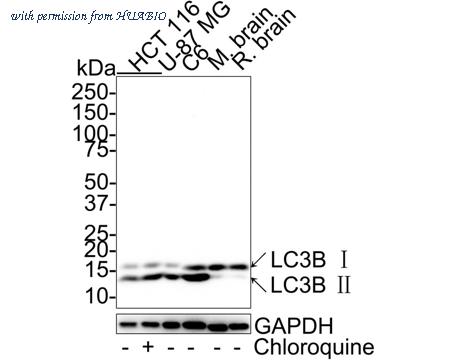 Western blot analysis of LC3B on different lysates with Rabbit anti-LC3B antibody (HA750319) at 1/2,000 dilution. Lane 1: HCT 116 cell lysate Lane 2: HCT 116 treated with 50μM Chloroquine for 18 hours cell lysate Lane 3: U-87 MG cell lysate Lane 4: C6 cell lysate Lane 5: Mouse brain tissue lysate Lane 6: Rat brain tissue lysate Lysates/proteins at 20 µg/Lane. Predicted band size: 14/16 kDa Observed band size: 14/16 kDa Exposure time: 26 seconds; ECL: K1801; 4-20% SDS-PAGE gel. Proteins were transferred to a PVDF membrane and blocked with 5% NFDM/TBST for 1 hour at room temperature. The primary antibody (HA750319) at 1/2,000 dilution was used in 5% NFDM/TBST at 4℃ overnight. Goat Anti-Rabbit IgG - HRP Secondary Antibody (HA1001) at 1/50,000 dilution was used for 1 hour at room temperature.