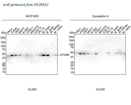 Western blot analysis of ATG4B on different lysates with Rabbit anti-ATG4B antibody (HA721829) at 1/2,000 dilution and competitor's antibody at 1/2,000 dilution. Lane 1: HeLa cell lysate Lane 2: Jurkat cell lysate Lane 3: 293T cell lysate Lane 4: MCF7 cell lysate Lane 5: K-562 cell lysate Lane 6: COS-1 cell lysate Lane 7: NIH/3T3 cell lysate Lane 8: C2C12 cell lysate Lane 9: PC-12 cell lysate Lane 10: Mouse brain tissue lysate Lane 11: Rat brain tissue lysate Lane 12: Mouse kidney tissue lysate Lane 13: Mouse colon tissue lysate Lysates/proteins at 30 µg/Lane. Predicted band size: 44 kDa Observed band size: 47 kDa Exposure time: 42 seconds; ECL: K1802; 4-20% SDS-PAGE gel. Proteins were transferred to a PVDF membrane and blocked with 5% NFDM/TBST for 1 hour at room temperature. The primary antibody (HA721829) at 1/2,000 dilution and competitor's antibody at 1/2,000 dilution were used in 5% NFDM/TBST at 4℃ overnight. Goat Anti-Rabbit IgG - HRP Secondary Antibody (HA1001) at 1/50,000 dilution was used for 1 hour at room temperature.