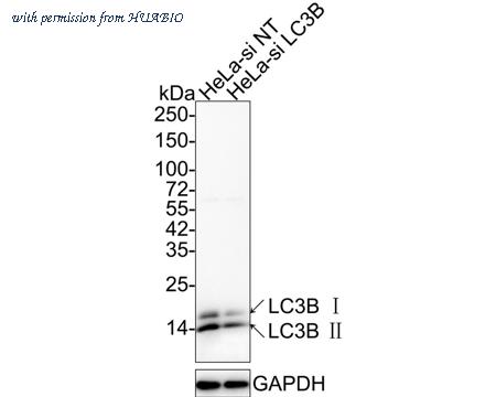 Western blot analysis of LC3B on different lysates with Rabbit anti-LC3B antibody (HA750319) at 1/2,000 dilution. Lane 1: HeLa-si NT cell lysate (10 µg/Lane) Lane 2: HeLa-si LC3B cell lysate (10 µg/Lane) Predicted band size: 14/16 kDa Observed band size: 14/16 kDa Exposure time: 1 minute; ECL: K1801; 4-20% SDS-PAGE gel. Proteins were transferred to a PVDF membrane and blocked with 5% NFDM/TBST for 1 hour at room temperature. The primary antibody (HA750319) at 1/2,000 dilution was used in 5% NFDM/TBST at 4℃ overnight. Goat Anti-Rabbit IgG - HRP Secondary Antibody (HA1001) at 1/50,000 dilution was used for 1 hour at room temperature.