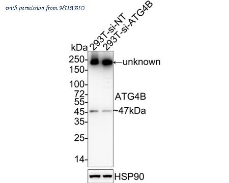 Western blot analysis of ATG4B on different lysates with Rabbit anti-ATG4B antibody (HA721829) at 1/1,000 dilution. Lane 1: 293T-si NT cell lysate Lane 2: 293T-si ATG4B cell lysate Lysates/proteins at 10 µg/Lane. Predicted band size: 44 kDa Observed band size: 47 kDa Exposure time: 51 seconds; ECL: K1801; 4-20% SDS-PAGE gel. Proteins were transferred to a PVDF membrane and blocked with 5% NFDM/TBST for 1 hour at room temperature. The primary antibody (HA721829) at 1/1,000 dilution was used in 5% NFDM/TBST at 4℃ overnight. Goat Anti-Rabbit IgG - HRP Secondary Antibody (HA1001) at 1/50,000 dilution was used for 1 hour at room temperature.