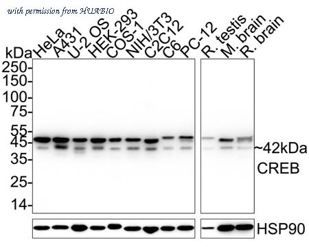 Western blot analysis of CREB on different lysates with Rabbit anti-CREB antibody (HA750007) at 1/2,000 dilution. Lane 1: HeLa cell lysate (20 µg/Lane) Lane 2: A431 cell lysate (20 µg/Lane) Lane 3: U-2 OS cell lysate (20 µg/Lane) Lane 4: HEK-293 cell lysate (20 µg/Lane) Lane 5: COS-1 cell lysate (20 µg/Lane) Lane 6: NIH/3T3 cell lysate (20 µg/Lane) Lane 7: C2C12 cell lysate (20 µg/Lane) Lane 8: C6 cell lysate (20 µg/Lane) Lane 9: PC-12 cell lysate (20 µg/Lane) Lane 10: Rat testis tissue lysate (40 µg/Lane) Lane 11: Mouse brain tissue lysate (40 µg/Lane) Lane 12: Rat brain tissue lysate (40 µg/Lane) Predicted band size: 35 kDa Observed band size: 42 kDa Exposure time: 6 seconds; ECL: K1801; 4-20% SDS-PAGE gel. Proteins were transferred to a PVDF membrane and blocked with 5% NFDM/TBST for 1 hour at room temperature. The primary antibody (HA750007) at 1/2,000 dilution was used in 5% NFDM/TBST at 4℃ overnight. Goat Anti-Rabbit IgG - HRP Secondary Antibody (HA1001) at 1/50,000 dilution was used for 1 hour at room temperature.