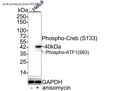 Western blot analysis of Phospho-Creb (S133) on different lysates with Rabbit anti-Phospho-Creb (S133) antibody (HA750465) at 1/1,000 dilution. Lane 1: HeLa whole cell lysate Lane 2: HeLa treated with 25μg/mL anisomycin for 30 minutes whole cell lysate Lysates/proteins at 20 µg/Lane. Predicted band size: 35 kDa Observed band size: 40 kDa Exposure time: 3 minutes; 4-20% SDS-PAGE gel. Proteins were transferred to a PVDF membrane and blocked with 5% NFDM/TBST for 1 hour at room temperature. The primary antibody (HA750465) at 1/1,000 dilution was used in 5% NFDM/TBST at room temperature for 2 hours. Goat Anti-Rabbit IgG - HRP Secondary Antibody (HA1001) at 1/100,000 dilution was used for 1 hour at room temperature.
