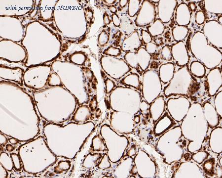 Immunohistochemical analysis of paraffin-embedded human thyroid tissue using anti-CREB antibody. The section was pre-treated using heat mediated antigen retrieval with sodium citrate buffer (pH 6.0) (high pressure) for 2 minutes. The tissues were blocked in 5% BSA for 30 minutes at room temperature, washed with ddH2O and PBS, and then probed with the primary antibody (HA750007, 1/500) for 30 minutes at room temperature. The detection was performed using an HRP conjugated compact polymer system. DAB was used as the chromogen. Tissues were counterstained with hematoxylin and mounted with DPX.