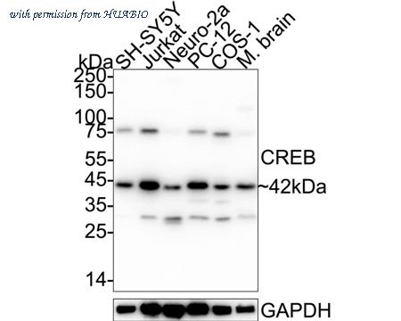 Western blot analysis of CREB on different lysates with Rabbit anti-CREB antibody (HA723754) at 1/50,000 dilution. Lane 1: SH-SY5Y cell lysate (20 µg/Lane) Lane 2: Jurkat cell lysate (20 µg/Lane) Lane 3: Neuro-2a cell lysate (20 µg/Lane) Lane 4: PC-12 cell lysate (20 µg/Lane) Lane 5: COS-1 cell lysate (20 µg/Lane) Lane 6: Mouse brain tissue lysate (40 µg/Lane) Predicted band size: 35 kDa Observed band size: 42 kDa Exposure time: 10 seconds; ECL: K1801; 4-20% SDS-PAGE gel. Proteins were transferred to a PVDF membrane and blocked with 5% NFDM/TBST for 1 hour at room temperature. The primary antibody (HA723754) at 1/50,000 dilution was used in primary antibody dilution (K1803) at 4℃ overnight. Goat Anti-Rabbit IgG - HRP Secondary Antibody (HA1001) at 1/50,000 dilution was used for 1 hour at room temperature.