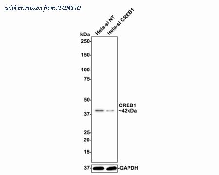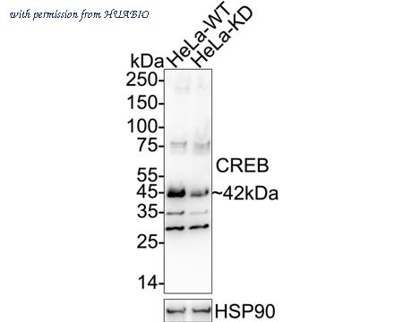 Western blot analysis of CREB on different lysates with Rabbit anti-CREB antibody (HA751563) at 1/20,000 dilution. Lane 1: HeLa-parental cell lysate Lane 2: HeLa-CREB KD cell lysate Lysates/proteins at 10 µg/Lane. Predicted band size: 35 kDa Observed band size: 42 kDa Exposure time: 1 minute; ECL: K1801; 4-20% SDS-PAGE gel. Proteins were transferred to a PVDF membrane and blocked with 5% NFDM/TBST for 1 hour at room temperature. The primary antibody (HA751563) at 1/20,000 dilution was used in primary antibody dilution (K1803) at 4℃ overnight. Goat Anti-Rabbit IgG - HRP Secondary Antibody (HA1001) at 1/50,000 dilution was used for 1 hour at room temperature.