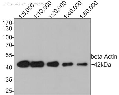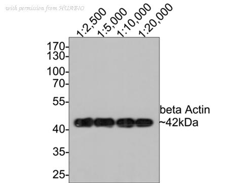 Western blot analysis of beta Actin on NIH/3T3 cell lysates with Mouse anti-beta Actin antibody (HA610019) at different dilutions. Lysates/proteins at 10 µg/Lane. Predicted band size: 42 kDa Observed band size: 42 kDa Exposure time: 5 minutes; 10% SDS-PAGE gel. Proteins were transferred to a PVDF membrane and blocked with 5% NFDM/TBST for 1 hour at room temperature. The primary antibody (HA610019) at different dilutions was used in 5% NFDM/TBST at room temperature for 2 hours. Goat Anti-Mouse IgG - HRP Secondary Antibody (HA1006) at 1:100,000 dilution was used for 1 hour at room temperature.