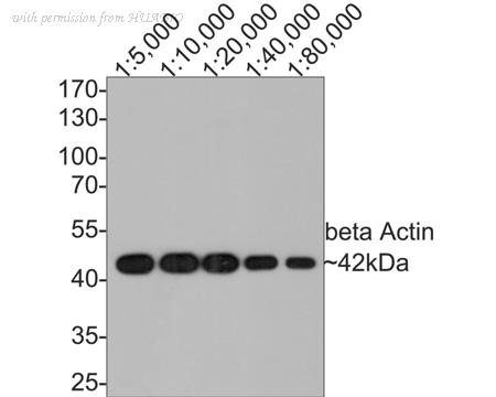 Western blot analysis of beta Actin on HepG2 cell lysates with Mouse anti-beta Actin antibody (HA610019) at different dilutions. Lysates/proteins at 10 µg/Lane. Predicted band size: 42 kDa Observed band size: 42 kDa Exposure time: 5 minutes; 10% SDS-PAGE gel. Proteins were transferred to a PVDF membrane and blocked with 5% NFDM/TBST for 1 hour at room temperature. The primary antibody (HA610019) at different dilutions was used in 5% NFDM/TBST at room temperature for 2 hours. Goat Anti-Mouse IgG - HRP Secondary Antibody (HA1006) at 1/100,000 dilution was used for 1 hour at room temperature.