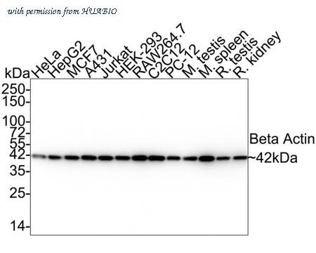 Western blot analysis of beta Actin on different lysates with Mouse anti-beta Actin antibody (M1210-2) at 1/20,000 dilution. Lane 1: HeLa cell lysate Lane 2: HepG2 cell lysate Lane 3: MCF7 cell lysate Lane 4: A431 cell lysate Lane 5: Jurkat cell lysate Lane 6: HEK-293 cell lysate Lane 7: RAW264.7 cell lysate Lane 8: C2C12 cell lysate Lane 9: PC-12 cell lysate Lane 10: Mouse testis tissue lysate Lane 11: Mouse spleen tissue lysate Lane 12: Rat testis tissue lysate Lane 13: Rat kidney tissue lysate Lysates/proteins at 10 µg/Lane. Predicted band size: 42 kDa Observed band size: 42 kDa Exposure time: 10 seconds; 4-20% SDS-PAGE gel. Proteins were transferred to a PVDF membrane and blocked with 5% NFDM/TBST for 1 hour at room temperature. The primary antibody (M1210-2) at 1/20,000 dilution was used in 5% NFDM/TBST at 4℃ overnight. Goat Anti-Mouse IgG - HRP Secondary Antibody (HA1006) at 1/50,000 dilution was used for 1 hour at room temperature.