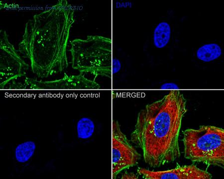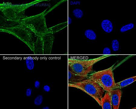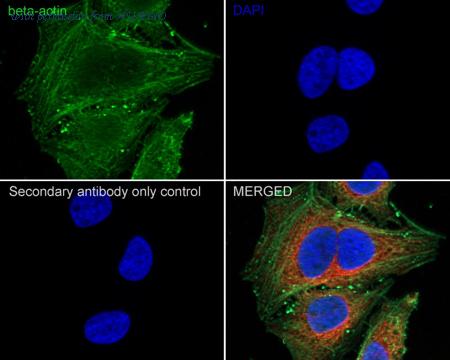 Immunocytochemistry analysis of HeLa cells labeling beta Actin with Rabbit anti-beta Actin antibody (HA750898) at 1/250 dilution. Cells were fixed in 4% paraformaldehyde for 20 minutes at room temperature, permeabilized with 0.1% Triton X-100 in PBS for 5 minutes at room temperature, then blocked with 1% BSA in 10% negative goat serum for 1 hour at room temperature. Cells were then incubated with Rabbit anti-beta Actin antibody (HA750898) at 1/250 dilution in 1% BSA in PBST overnight at 4 ℃. Goat Anti-Rabbit IgG H&L (iFluor™ 488, HA1121) was used as the secondary antibody at 1/1,000 dilution. PBS instead of the primary antibody was used as the secondary antibody only control. Nuclear DNA was labelled in blue with DAPI. Beta tubulin (M1305-2, red) was stained at 1/100 dilution overnight at +4℃. Goat Anti-Mouse IgG H&L (iFluor™ 594, HA1126) was used as the secondary antibody at 1/1,000 dilution.