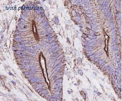 Immunohistochemical analysis of paraffin-embedded human colon carcinoma tissue using anti-beta Actin antibody. The section was pre-treated using heat mediated antigen retrieval with Tris-EDTA buffer (pH 9.0) for 20 minutes.The tissues were blocked in 1% BSA for 30 minutes at room temperature, washed with ddH2O and PBS, and then probed with the primary antibody (M1210-2, 1/50) for 30 minutes at room temperature. The detection was performed using an HRP conjugated compact polymer system. DAB was used as the chromogen. Tissues were counterstained with hematoxylin and mounted with DPX.