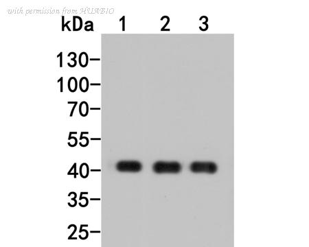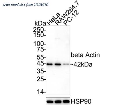 Western blot analysis of beta Actin on different lysates with Rabbit anti-beta Actin antibody (R1102-1) at 1/50,000 dilution. Lane 1: HeLa cell lysate Lane 2: RAW264.7 cell lysate Lane 3: PC-12 cell lysate Lysates/proteins at 10 µg/Lane. Predicted band size: 42 kDa Observed band size: 42 kDa Exposure time: 3 minutes; ECL: K1801; 4-20% SDS-PAGE gel. Proteins were transferred to a PVDF membrane and blocked with 5% NFDM/TBST for 1 hour at room temperature. The primary antibody (R1102-1) at 1/50,000 dilution was used in 5% NFDM/TBST at 4℃ overnight. Goat Anti-Rabbit IgG - HRP Secondary Antibody (HA1001) at 1/50,000 dilution was used for 1 hour at room temperature.
