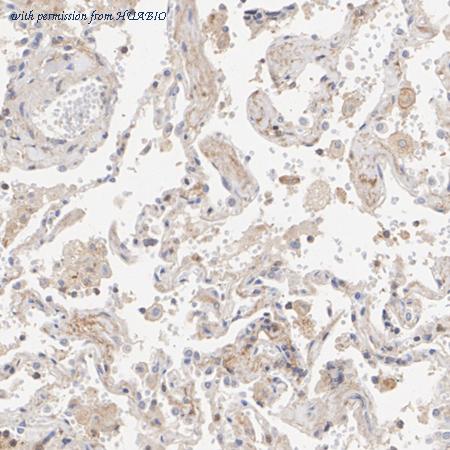 Immunohistochemical analysis of paraffin-embedded human lung tissue with Rabbit anti-beta Actin antibody (R1102-1) at 1/1,000 dilution. The section was pre-treated using heat mediated antigen retrieval with Tris-EDTA buffer (pH 9.0) for 20 minutes. The tissues were blocked in 1% BSA for 20 minutes at room temperature, washed with ddH2O and PBS, and then probed with the primary antibody (R1102-1) at 1/1,000 dilution for 1 hour at room temperature. The detection was performed using an HRP conjugated compact polymer system. DAB was used as the chromogen. Tissues were counterstained with hematoxylin and mounted with DPX.