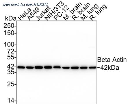 Western blot analysis of beta Actin on different lysates with Rabbit anti-beta Actin antibody (R1207-1) at 1/20,000 dilution. Lane 1: HeLa cell lysate Lane 2: A549 cell lysate Lane 3: Jurkat cell lysate Lane 4: NIH/3T3 cell lysate Lane 5: PC-12 cell lysate Lane 6: Mouse brain tissue lysate Lane 7: Rat brain tissue lysate Lane 8: Mouse lung tissue lysate Lane 9: Rat lung tissue lysate Lysates/proteins at 20 µg/Lane. Predicted band size: 42 kDa Observed band size: 42 kDa Exposure time: 30 seconds; 4-20% SDS-PAGE gel. Proteins were transferred to a PVDF membrane and blocked with 5% NFDM/TBST for 1 hour at room temperature. The primary antibody (R1207-1) at 1/20,000 dilution was used in 5% NFDM/TBST at 4℃ overnight. Goat Anti-Rabbit IgG - HRP Secondary Antibody (HA1001) at 1/50,000 dilution was used for 1 hour at room temperature.