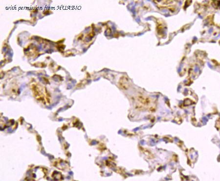 Immunohistochemical analysis of paraffin-embedded human lung tissue using anti-Caspase-1 antibody. Counter stained with hematoxylin.