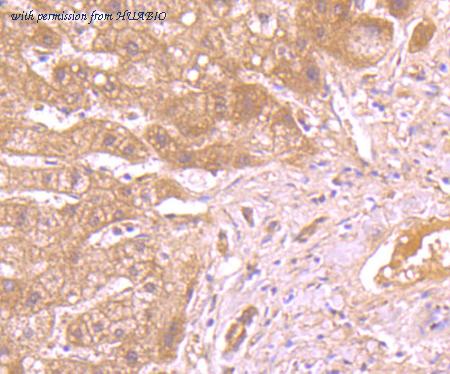 Immunohistochemical analysis of paraffin-embedded human liver cancer tissue using anti-Caspase-1 antibody. Counter stained with hematoxylin.