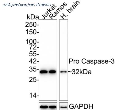 Western blot analysis of Pro Caspase-3 on different lysates with Rabbit anti-Pro Caspase-3 antibody (ER30804) at 1/5,000 dilution. Lane 1: Jurkat cell lysate Lane 2: Ramos cell lysate Lane 3: Human brain tissue lysate Lysates/proteins at 20 µg/Lane. Predicted band size: 32 kDa Observed band size: 32 kDa Exposure time: 3 minutes; ECL: K1801; 4-20% SDS-PAGE gel. Proteins were transferred to a PVDF membrane and blocked with 5% NFDM/TBST for 1 hour at room temperature. The primary antibody (ER30804) at 1/5,000 dilution was used in 5% NFDM/TBST at 4℃ overnight. Goat Anti-Rabbit IgG - HRP Secondary Antibody (HA1001) at 1/50,000 dilution was used for 1 hour at room temperature.