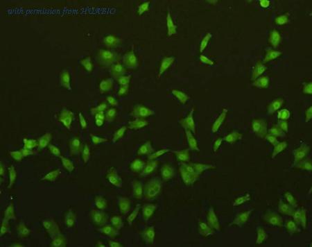ICC staining of Caspase-3 in HepG2 cells (green). Cells were fixed in paraformaldehyde, permeabilised with 0.25% Triton X100/PBS.