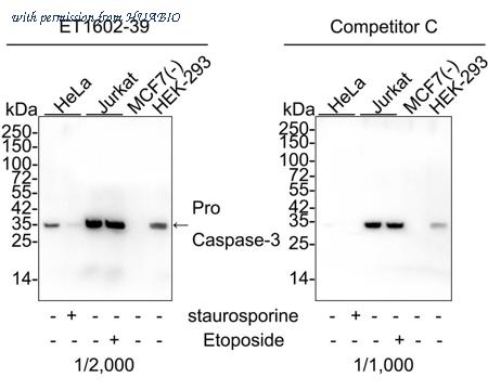 Western blot analysis of Pro Caspase-3 on different lysates with Rabbit anti-Pro Caspase-3 antibody (ET1602-39) at 1/2,000 dilution and competitor's antibody at 1/1,000 dilution. Lane 1: HeLa cell lysate Lane 2: HeLa treated with 1μM staurosporine for 3 hours cell lysate Lane 3: Jurkat cell lysate Lane 4: Jurkat treated with 25μM Etoposide for 5 hours cell lysate Lane 5: MCF7 cell lysate (negative) Lane 6: HEK-293 cell lysate Lysates/proteins at 20 µg/Lane. Predicted band size: 32 kDa Observed band size: 32 kDa Exposure time: 3 minutes 20 seconds; ECL: K1801; 4-20% SDS-PAGE gel. Proteins were transferred to a PVDF membrane and blocked with 5% NFDM/TBST for 1 hour at room temperature. The primary antibody (ET1602-39) at 1/2,000 dilution and competitor's antibody at 1/1,000 dilution were used in 5% NFDM/TBST at 4℃ overnight. Goat Anti-Rabbit IgG - HRP Secondary Antibody (HA1001) at 1/50,000 dilution was used for 1 hour at room temperature.